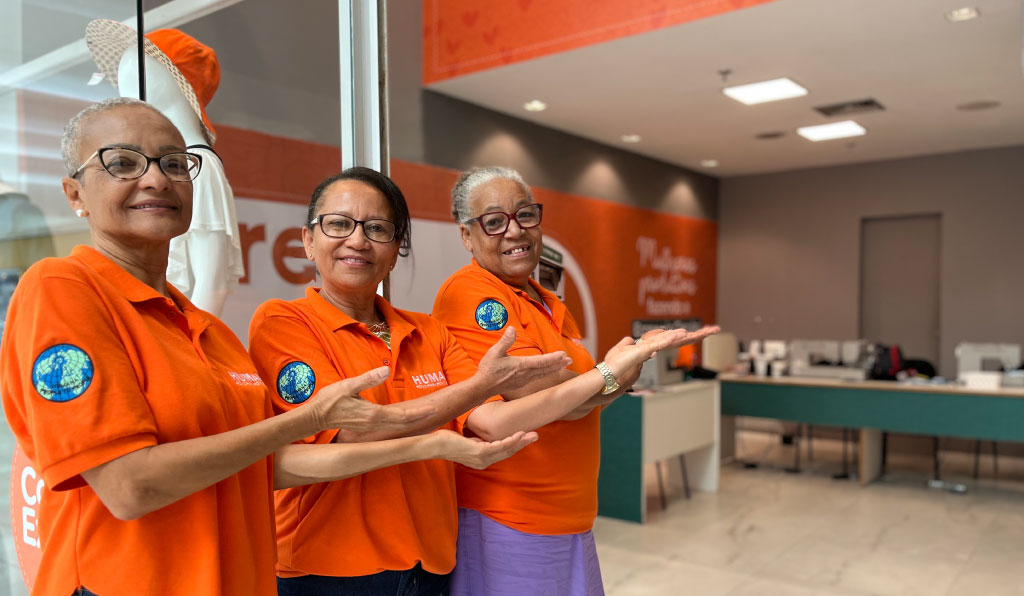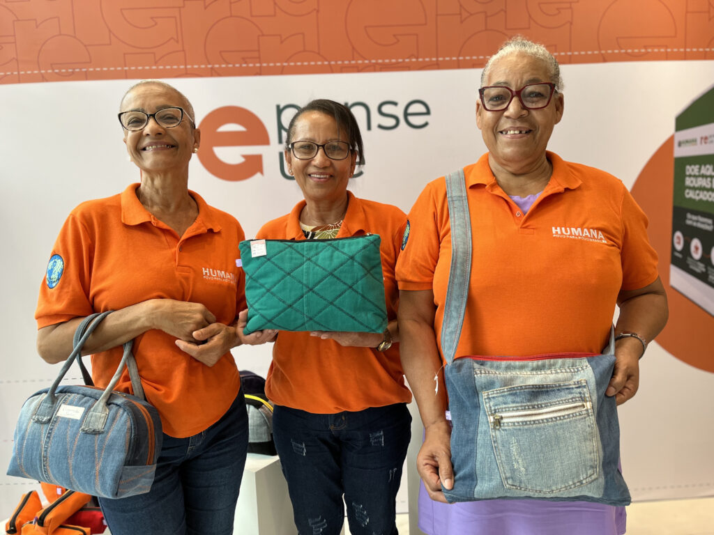 As costureiras que compõem o Grupo Produtivo participaram do curso de corte e costura do Projeto Futuro Aberto, uma das iniciativas de capacitação da Humana Brasil, realizada na comunidade de Castelo Branco. Hoje, o grupo recebe subsídios do Repense Reuse para propagar comercialmente as peças produzidas com a reutilização do têxtil pós-consumo.